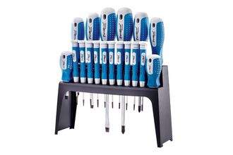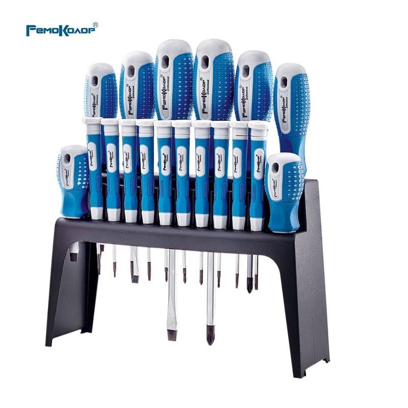 Набор отверток РемоКолор 33-2-705 включает в себя 18 отверток. Пластиковую подставку в которой располагаются отвертки можно поставить на поверхность или закрепить на стене. Отвертки изготовлены из хромованадиевой стали CrV. Твердость рабочей части 47-52 HRC. В набор входят стандартные и прецизионные отвертки.