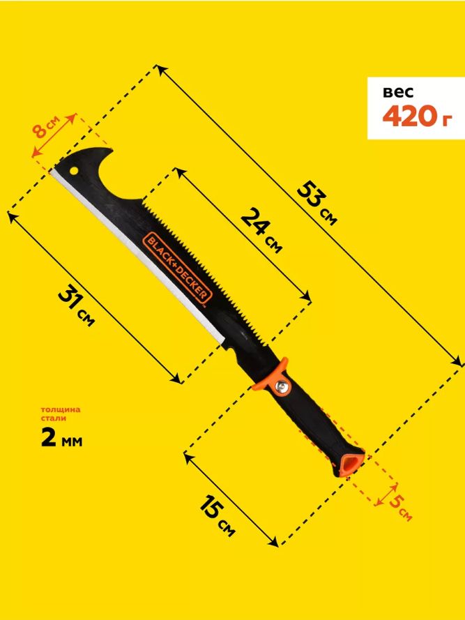 Mачете-секач-пила 3 в 1 Black+Decker 33621– это универсальный многофункциональный инструмент, который подойдет для выполнения работ с кустарниками, высокой травой и деревьями. Такая вещь пригодиться как рыбакам, охотникам и туристам, так и садоводам. С помощью такого мачете можно не только рубить, но и использовать в качестве ножовки.