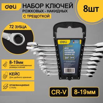 Набор комбинированных ключей с трещоткой DELI DL140108T включает в себя 8 ключей самых востребованных размеров.