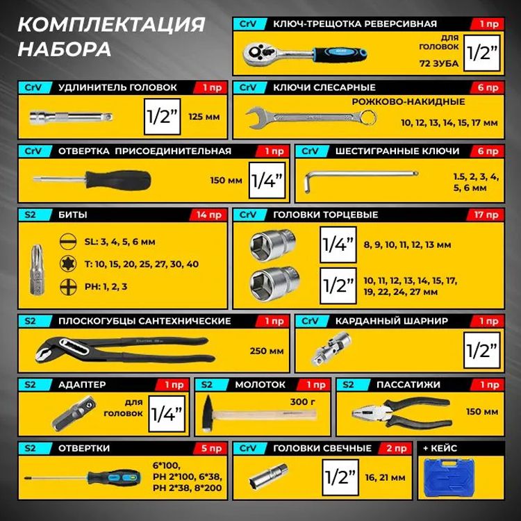 Головки 1/4": 8,9,10,11,12,13 мм по 1 шт; Головки 1/2": 10,11,12,13,14,15,17,19,22,24,27 по 1 шт; Свечные головки 1/2": 16 мм - 1 шт; 21 мм - 1 шт; Удлинитель головок 1/2" 125 мм - 1 шт; Карданный шарнир 1/2" - 1 шт; Адаптер 1/4" для бит - 1 шт; Ключ для работы с головками 1/4" отверточного типа 150 мм - 1 шт; Трещетка реверсивная для головок 1/2" 72 зуба - 1 шт; Ключи слесарные рожково-накидные: 10,12,13,14,15,17 мм по 1 шт; Шестигранные ключи: 1.5,2,3,4,5,6 мм по 1 шт; Молоток 300 гр - 1 шт; Клещи переставные 250 мм - 1 шт; Пассатижи 150 мм - 1 шт; Биты: Звездочки (TORX): T10,15,20,25,27,30,40 по 1 шт, Крестовые: PH1,2,3 по 1 шт, SL: 3,4,5,6 мм по 1 шт; Отвертки: 6*100, PH2*100, 6*38, PH2*38, 8*200 по 1 шт; Пластиковый кейс - 1 шт.