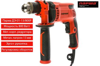 Дрель безударная Парма ДЭ-01-13/800Р предназначена для сверлильных работ. Используется для сверления отверстий в металле, дереве, пластике, ДСП, ДВП, фанере, ламинате и т.д.. Дрель Парма ДЭ-01-13/800Р сочетает в себе компактный размер с мощностью в 800 Ватт. Усиленный редуктор в металлическом корпусе продлевает срок службы инструмента.