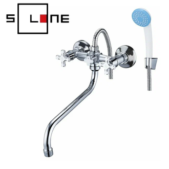 Смеситель для ванны двухвентильный с душевым шлангом и лейкой.