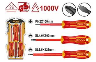 Набор диэлектрических отверток INGCO HKISD0308 INDUSTRIAL 3 шт. пригодится электрикам для выполнения работ под напряжением до 1000 В.