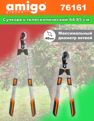 Сучкорез с телескопическими рукоятками AMIGO grande 76161 плоскостной. Используется для подрезки кустов, веток деревьев и стеблей растений. Максимальный диаметр реза 40 мм. Лезвия из японской стали SK5 долго сохраняют режущие свойства и обеспечивают ровный срез. Прочные телескопические рукоятки позволяют увеличить рычаг тем самым уменьшая прилагаемые усилия. Насадки из полипропилена с TPR-вставками способствуют комфортному захвату инструмента и не скользят во время работы. Длина инструмента изменяется и надежно фиксируется в положениях 64, 69,5, 74,5, 80 и 85 см. Телескопический сучкорез – это отличный инструмент для поддержания участка в благоприятном состоянии и ухода за растениями.